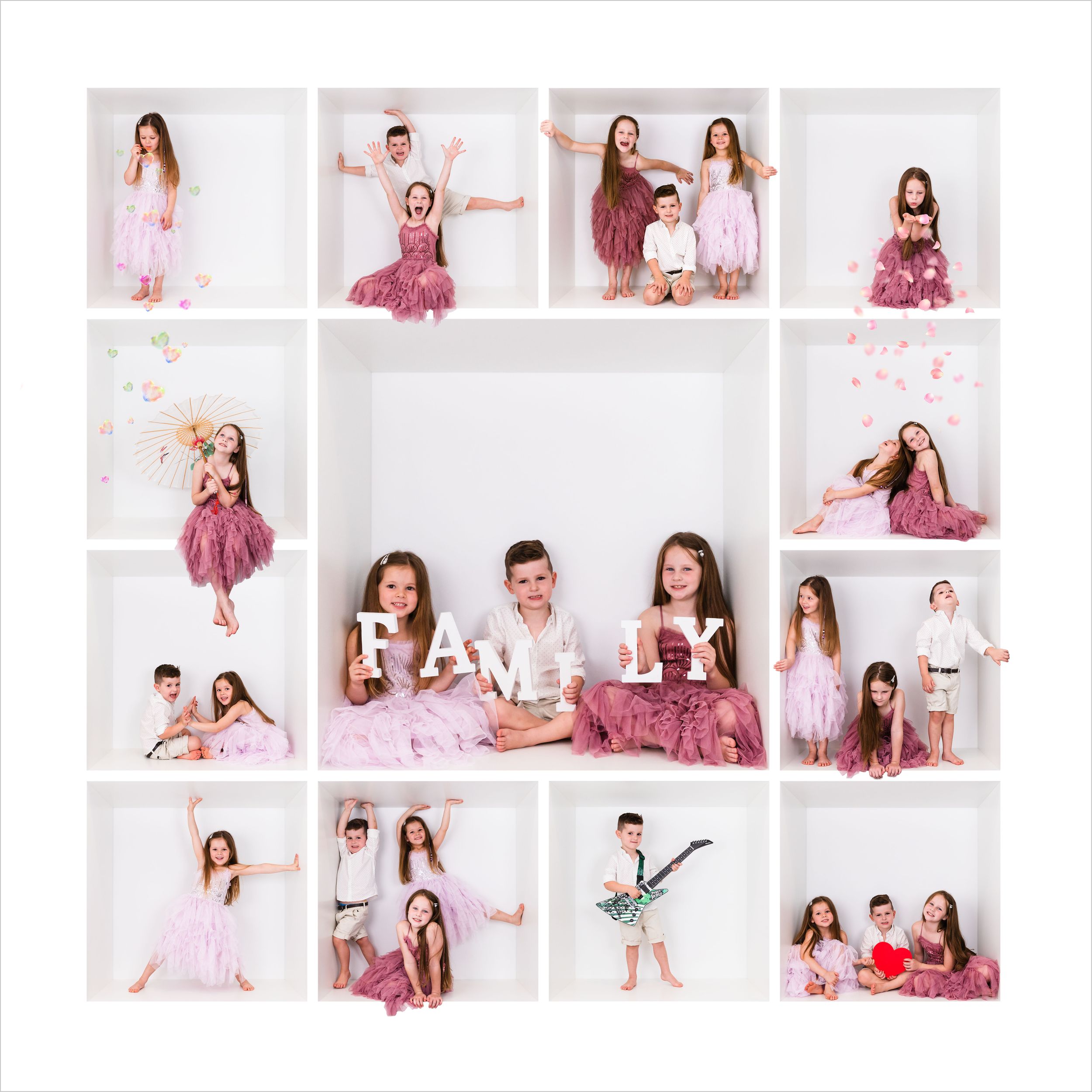 These sessions can be adapted to suit any occasion ..... family, siblings, birthdays, christmas, Easter, Halloween etc. Props are available to use but feel free to bring some of your own personal items to showcase your personality. All full box sessions come with a 16"x16" print of your final collage. Different layouts are available as well as borders or greeting card templates. Please just ask! Additional prints and products can be purchased separately.